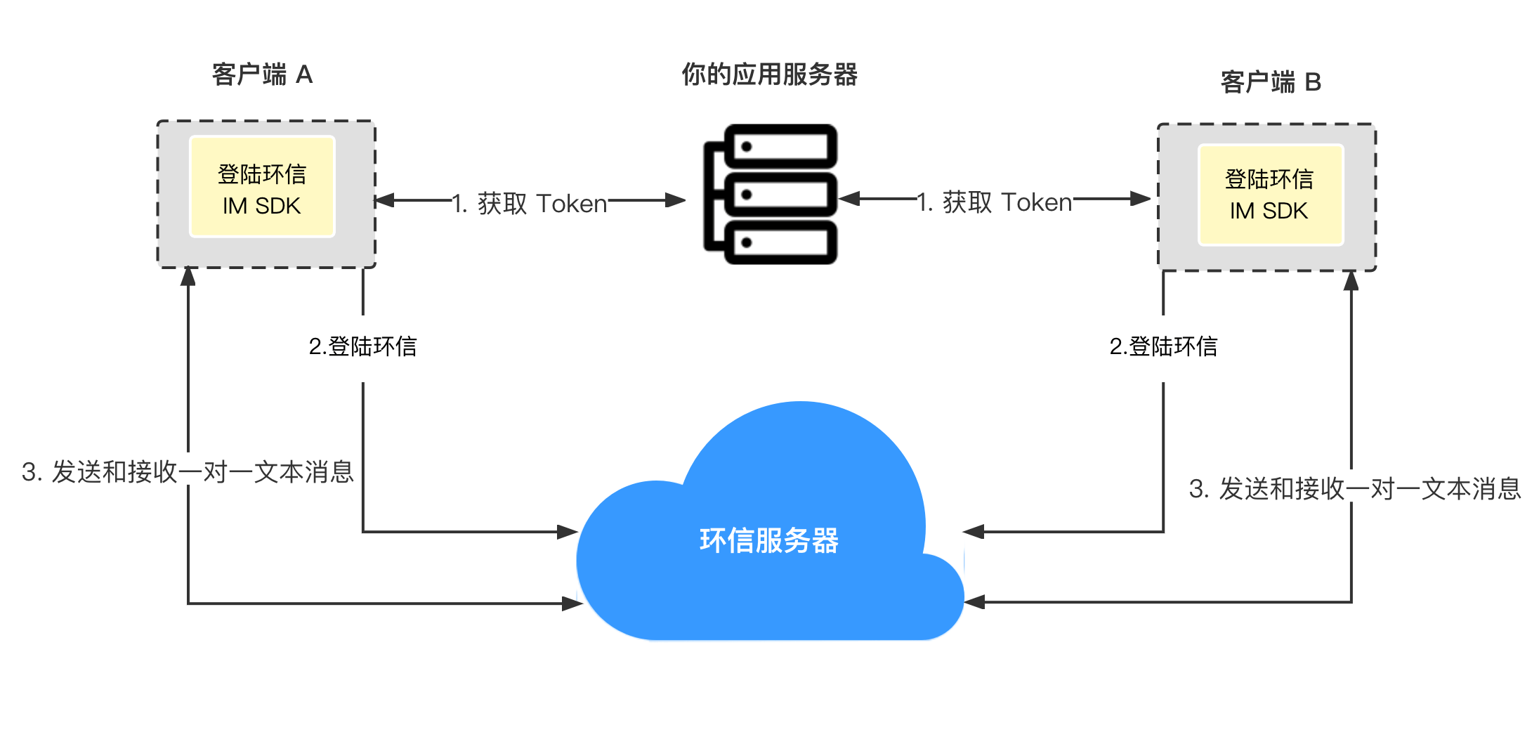 下图展示在客户端发送和接收一对一文本消息的工作流程。