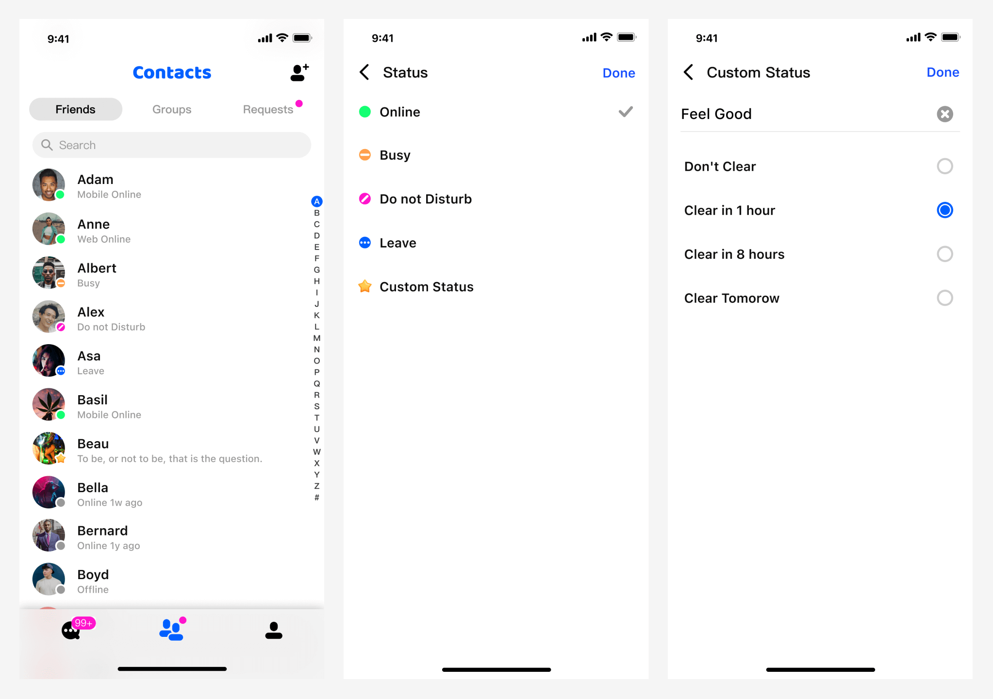 用户在线状态(即 Presence)包含用户的在线、离线以及自定义状态。