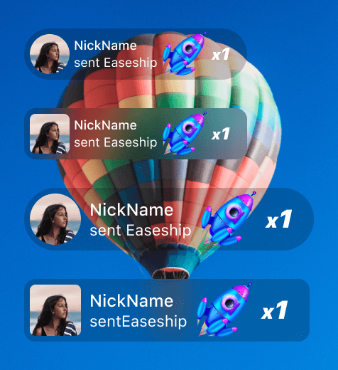 为国内直播场景常见的样式,可设为 Large、Small 两个尺寸, 默认驻留时间为 3 秒(可配置),事件并发时排队展示,可同时最多展示 2 条礼物消息
