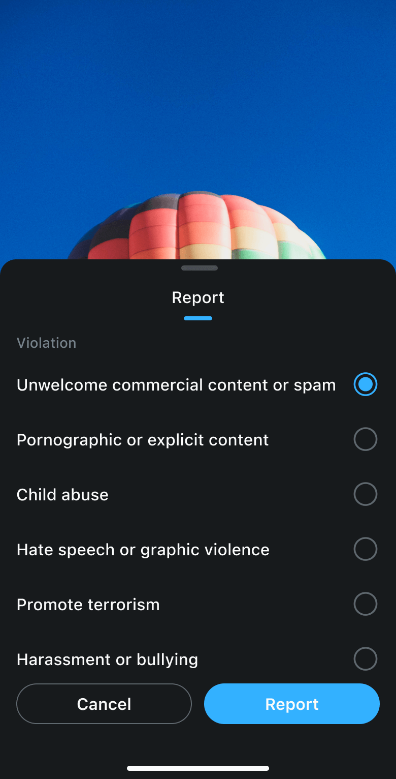 举报表单为消息操作的次级别页面,提供选择举报原因的单选项,选项数目可增减,选择后可提交举报。