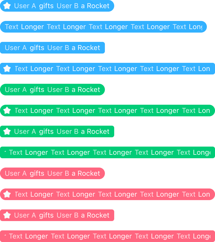 全局广播为超级管理员发送的所有直播间同时可见的非常驻消息,分为三种类型(具体类型需开发者自行定义)通过左侧图标和背景色示以区分。样式的可配项有:圆角、背景色、前景色,信息展示的可配项有左侧 icon(有或无),以及用户可以在自定义广播类型时修改 icon 资源图。消息仅支持单排显示,广播内容超过一屏显示范围为字幕滚动展示,滚动速率可配。