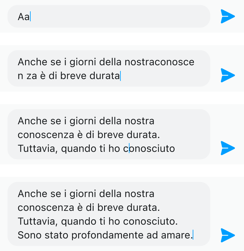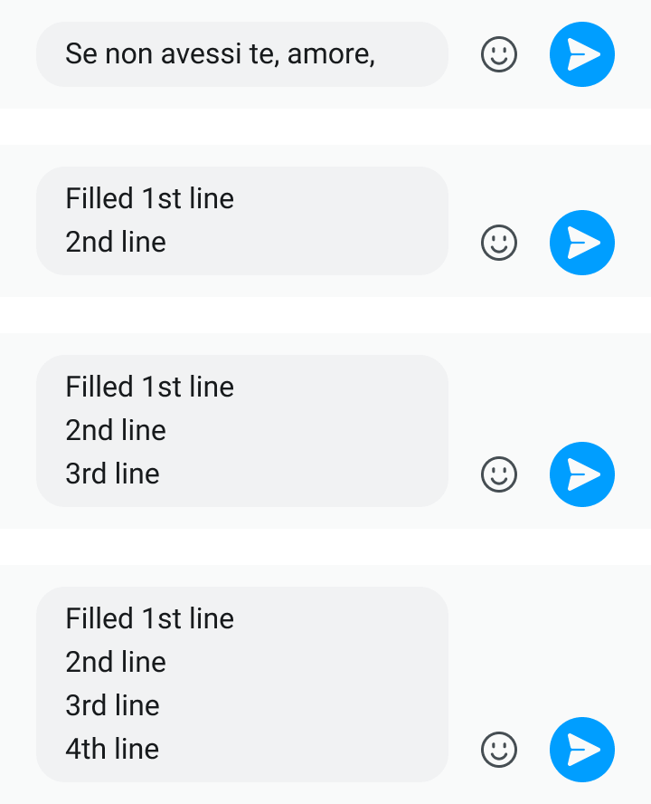 文本输入条内的文本输入区域为输入区域组件,当单行文本放不下时,文字可在输入区域内折行,对应的输入区域会累积行高,至多支持 4 行文本区域,输入文本超过 4 行后,文本分页展示,用户可滚动查看所键入的文本。