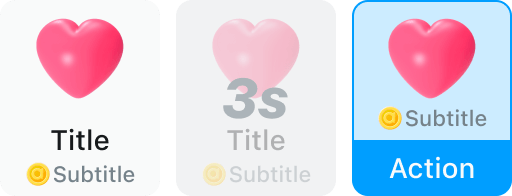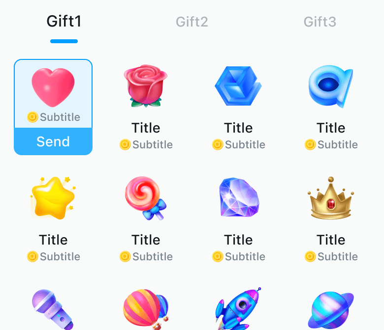 单个贴纸用以展示单个礼物消息样式,展示的信息有:礼物图片、礼物名称(Title)、礼物价值(Subtitle)。 礼物图片未读到时显示默认图,礼物价值可配置价值图标。 单个贴纸状态有 Enabled、Disabled(主要用于慢速发送,需要用户自行实现)、Focused 三种,Focused 时显示发送按钮。