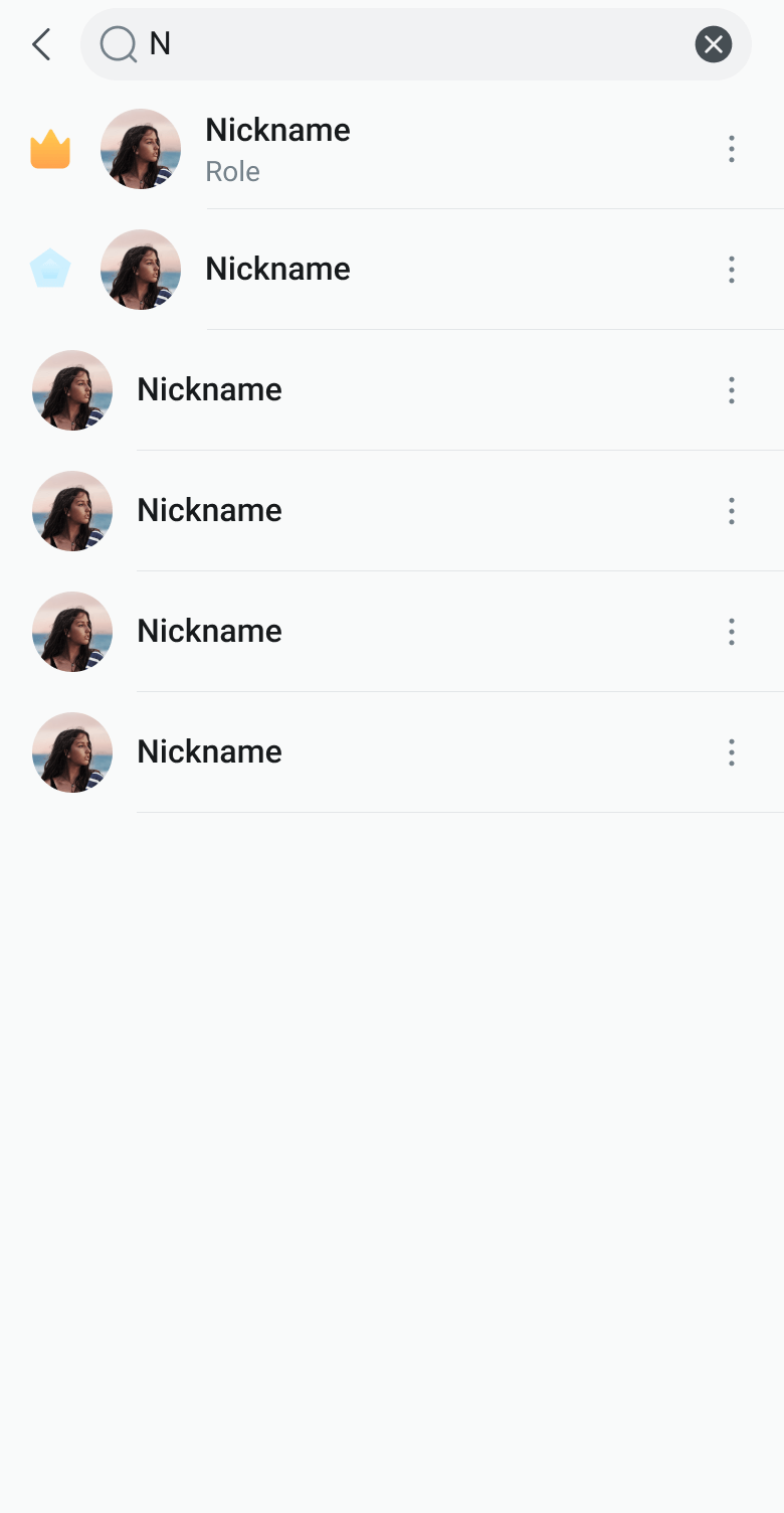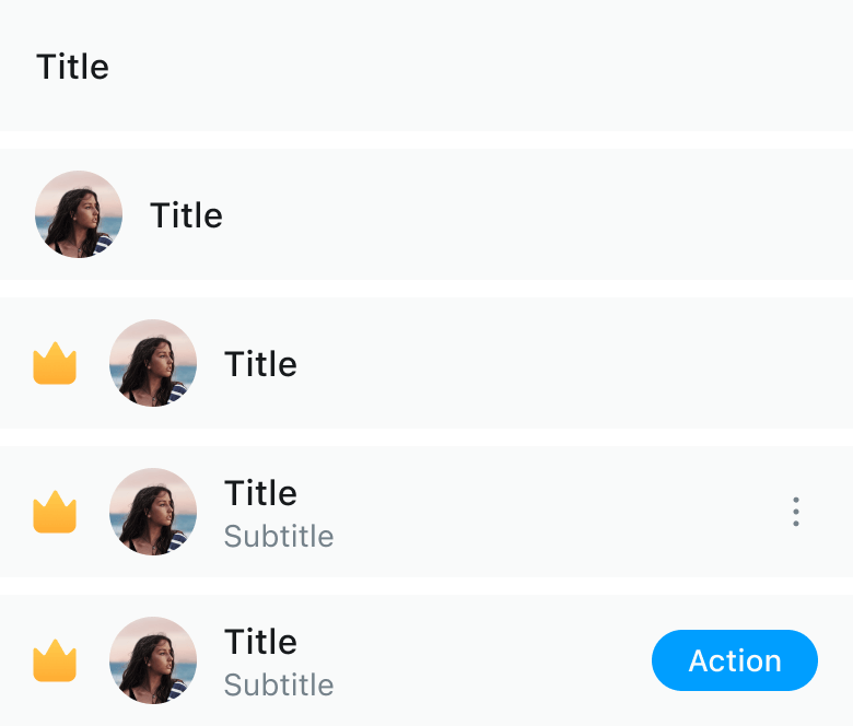 列表项展示当前成员信息,可展示的信息有徽章(Badge)、头像(Avatar)、用户名(Title)、用户详情(Subtitle),用户名为必要项,其他信息可配置。列表项目右侧支持 action btn,同时列表项支持点击/长按等事件
