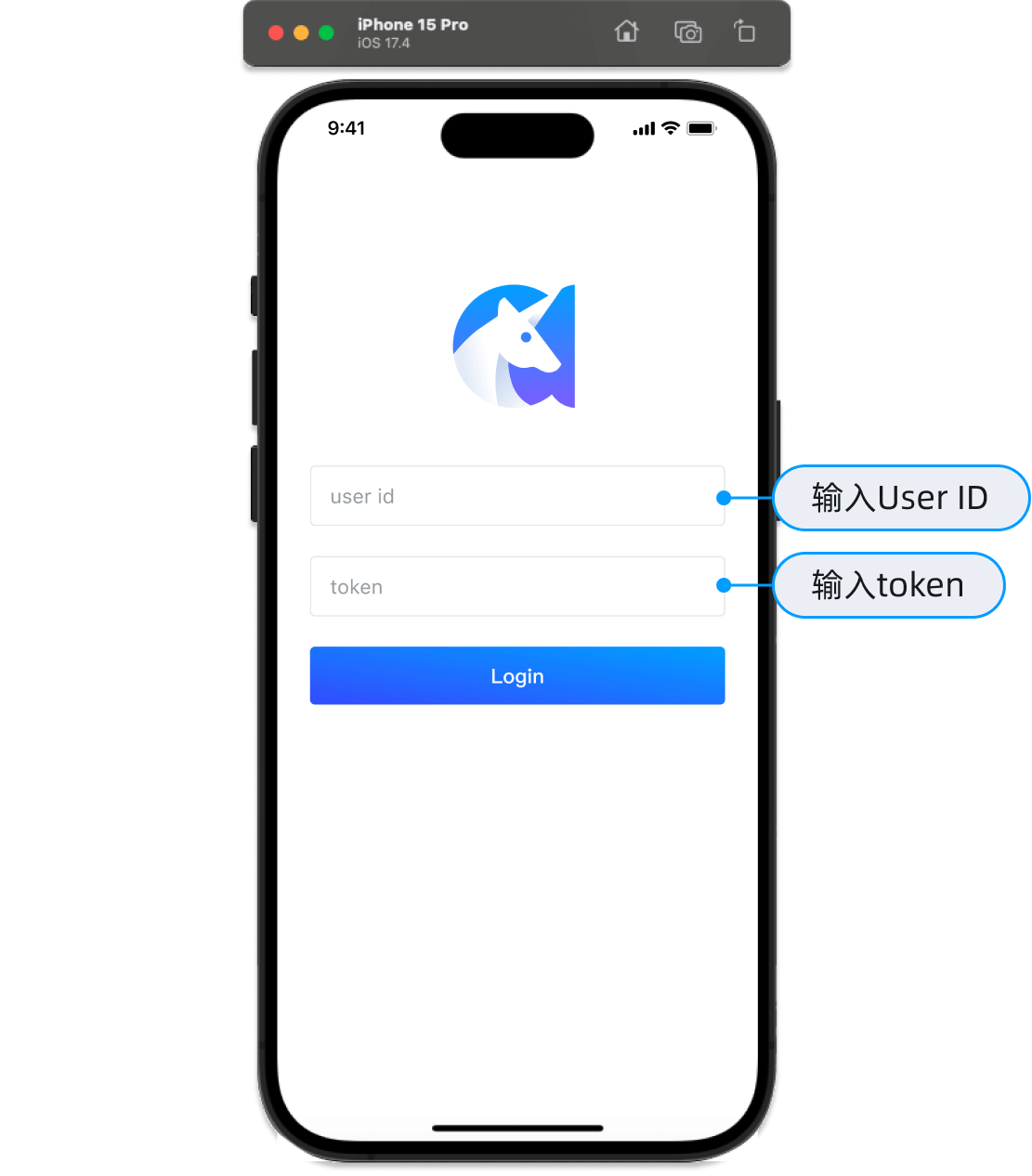 - 创建有效的环信 IM 用户,将用户的 ID 和 token 分别填入下图的两个输入框,点击 Login。